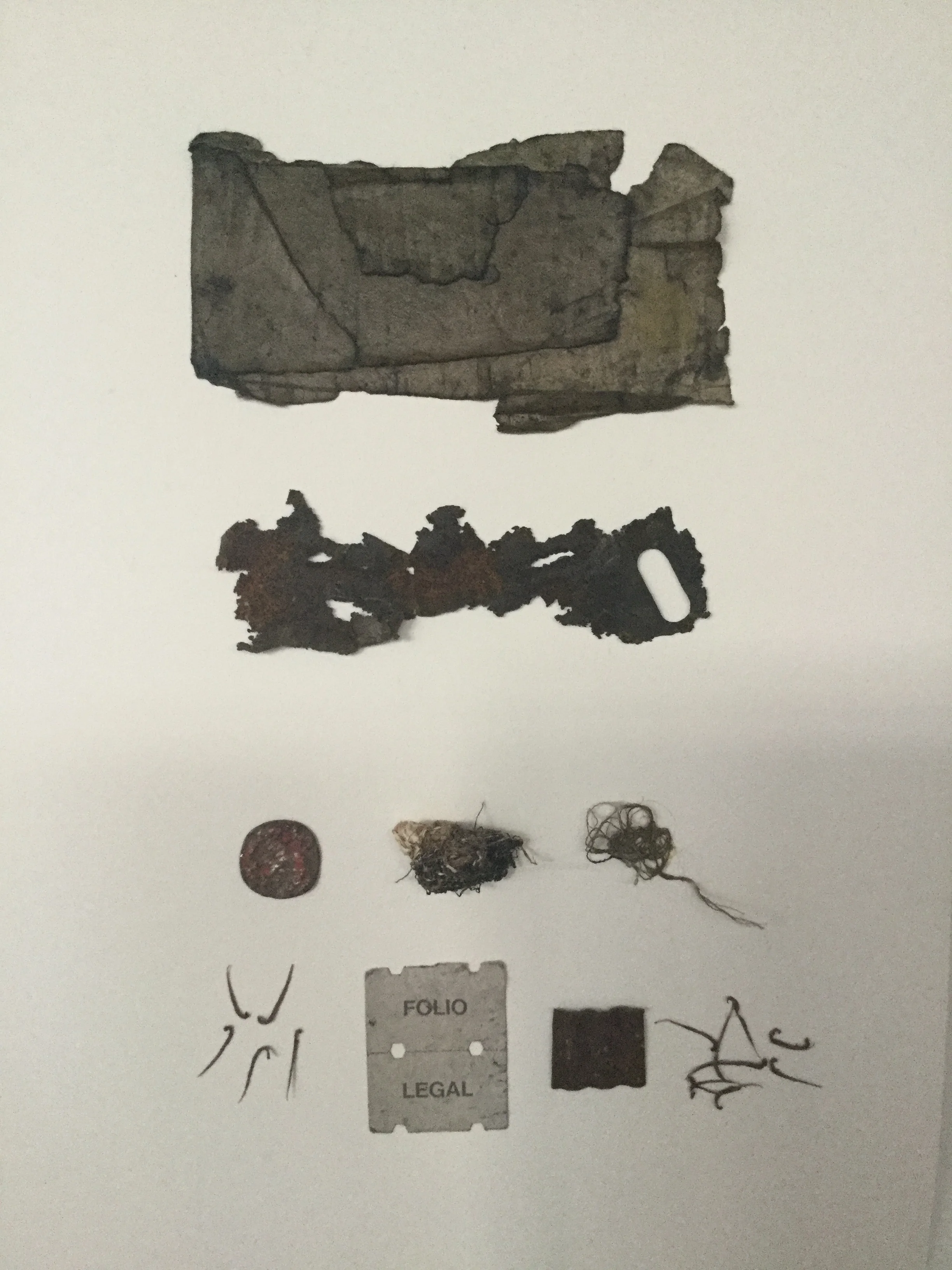 Tile. Burnt bicycle tire. Paper. Paint chips. Negative film. Corn silk.